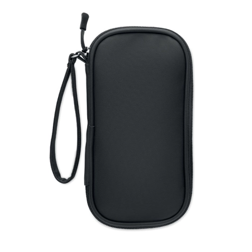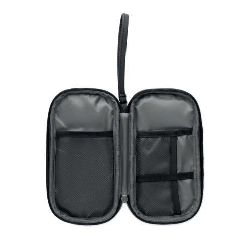 Tech organizer pouch in 600D RPET polyester with PU coating.