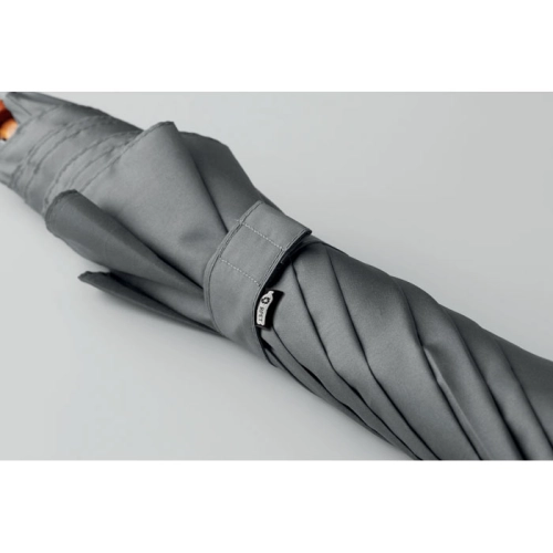 23 inch auto open umbrella in 190T RPET pongee with wooden shaft, tips and top. Black plated metal ribs. Curved natural finish wooden handle. Manual closure.