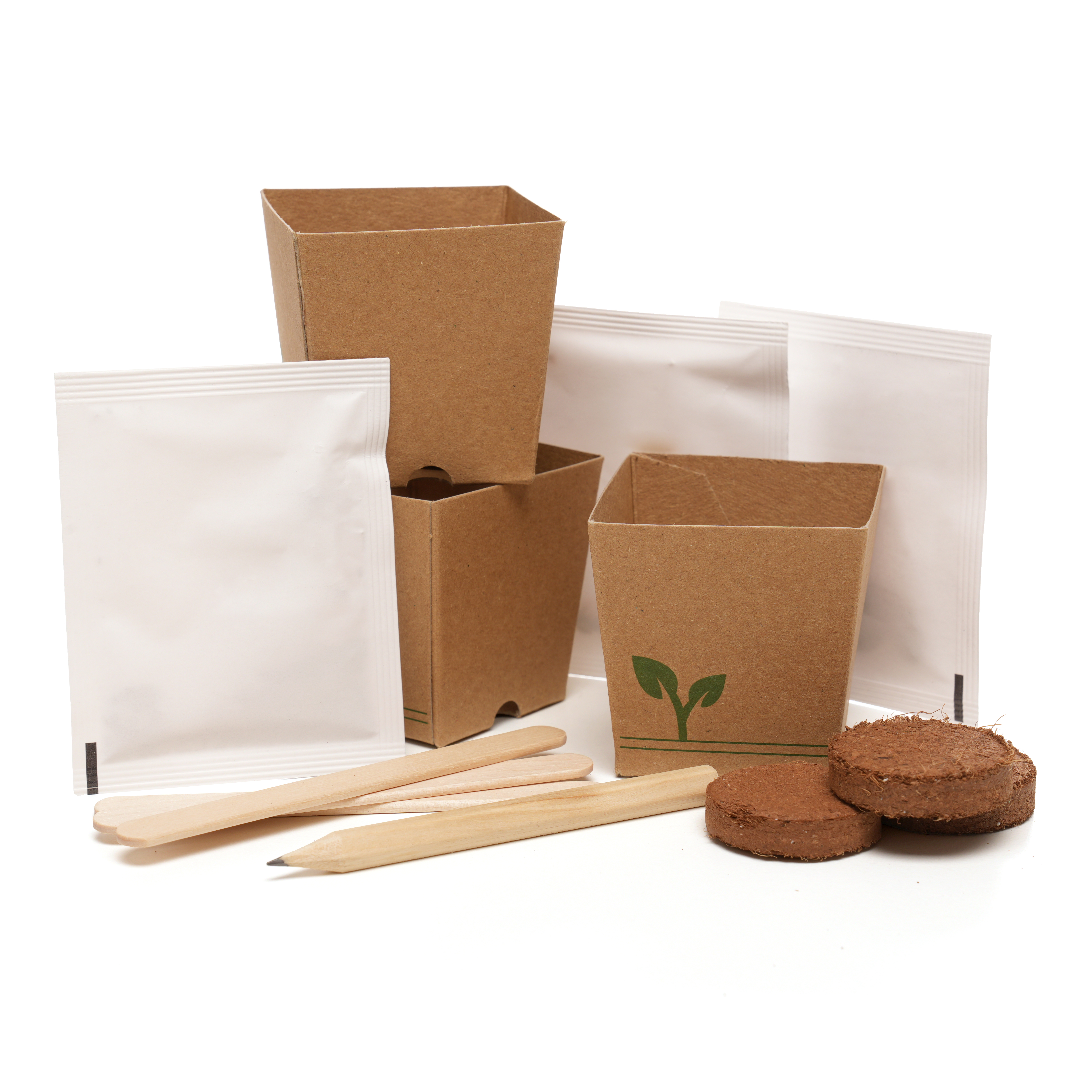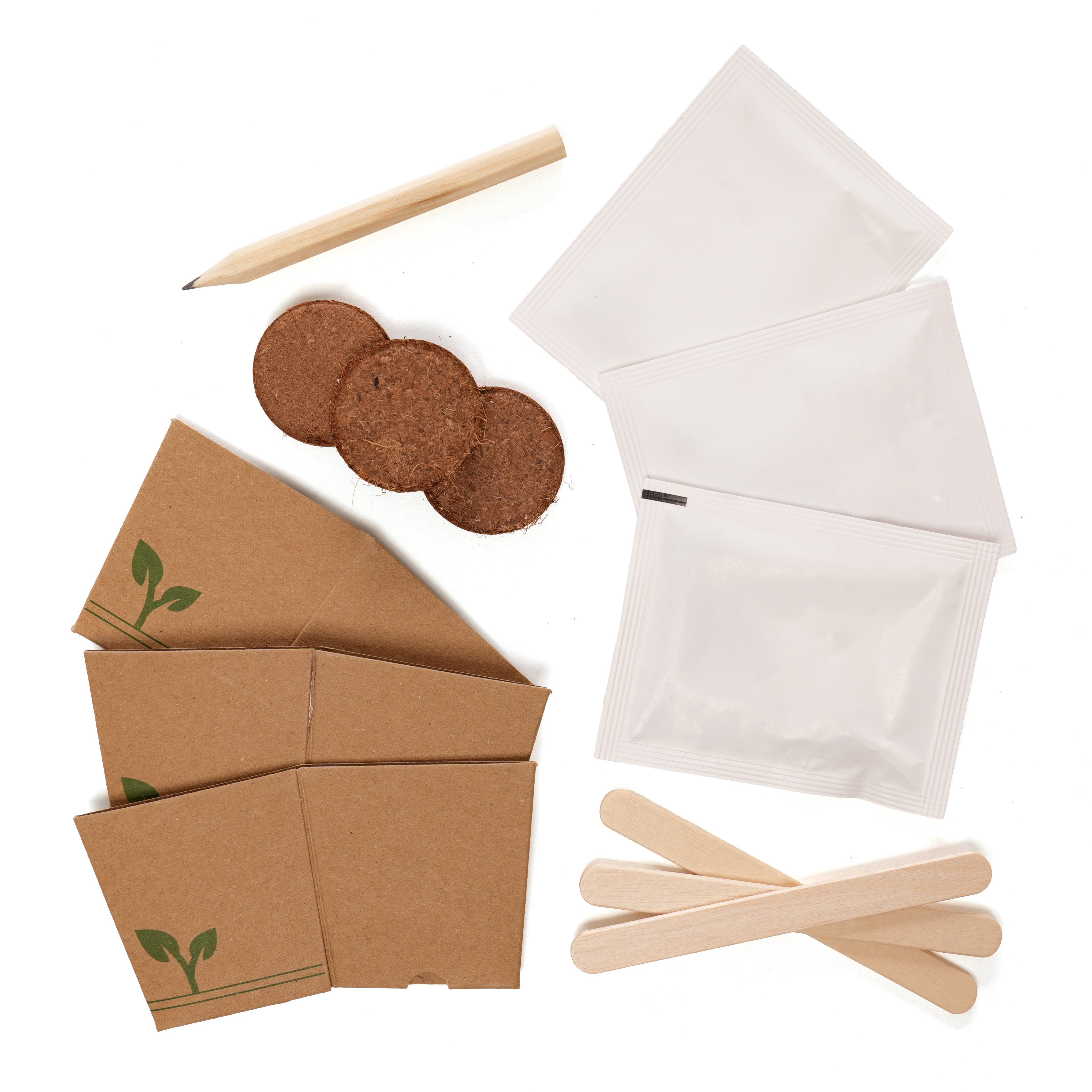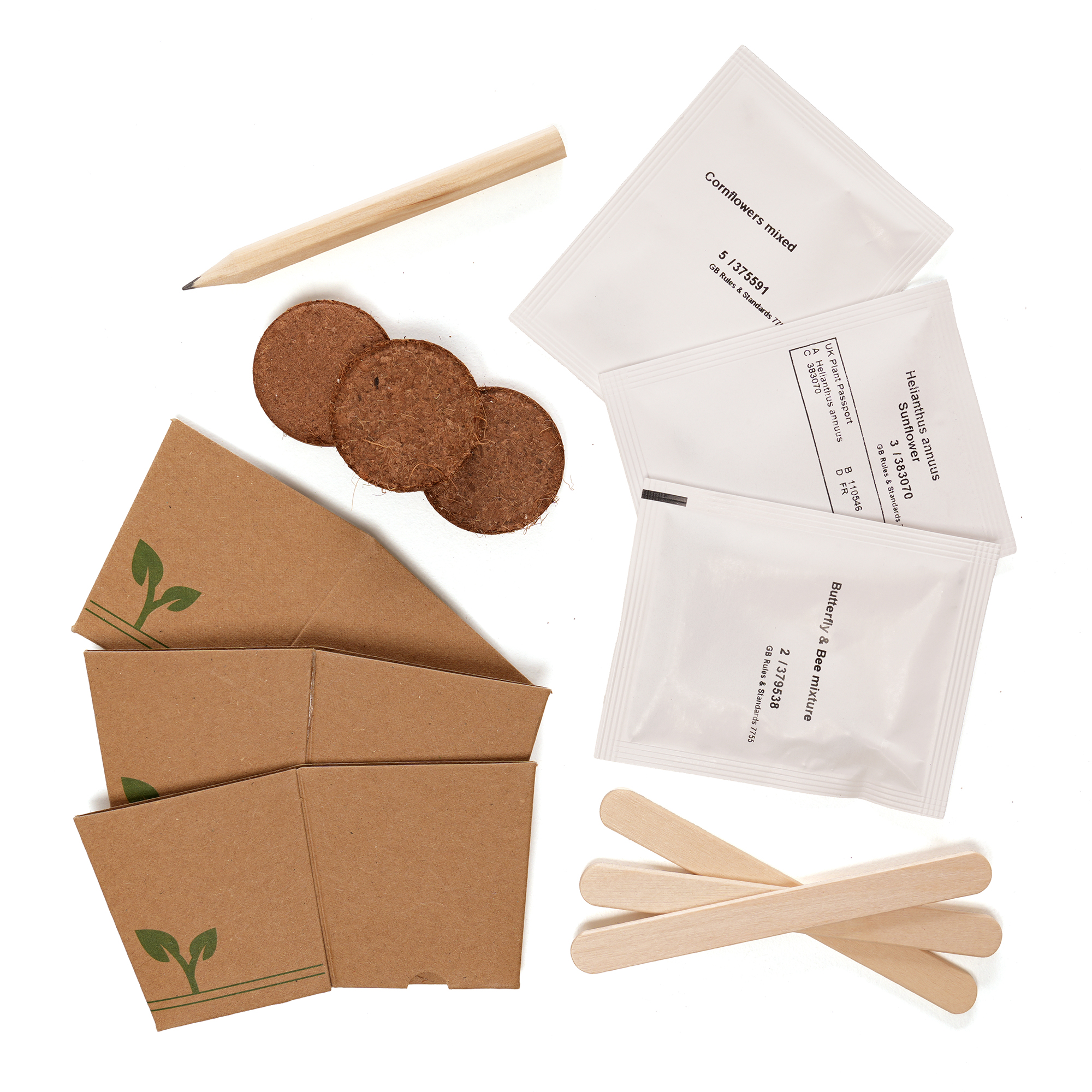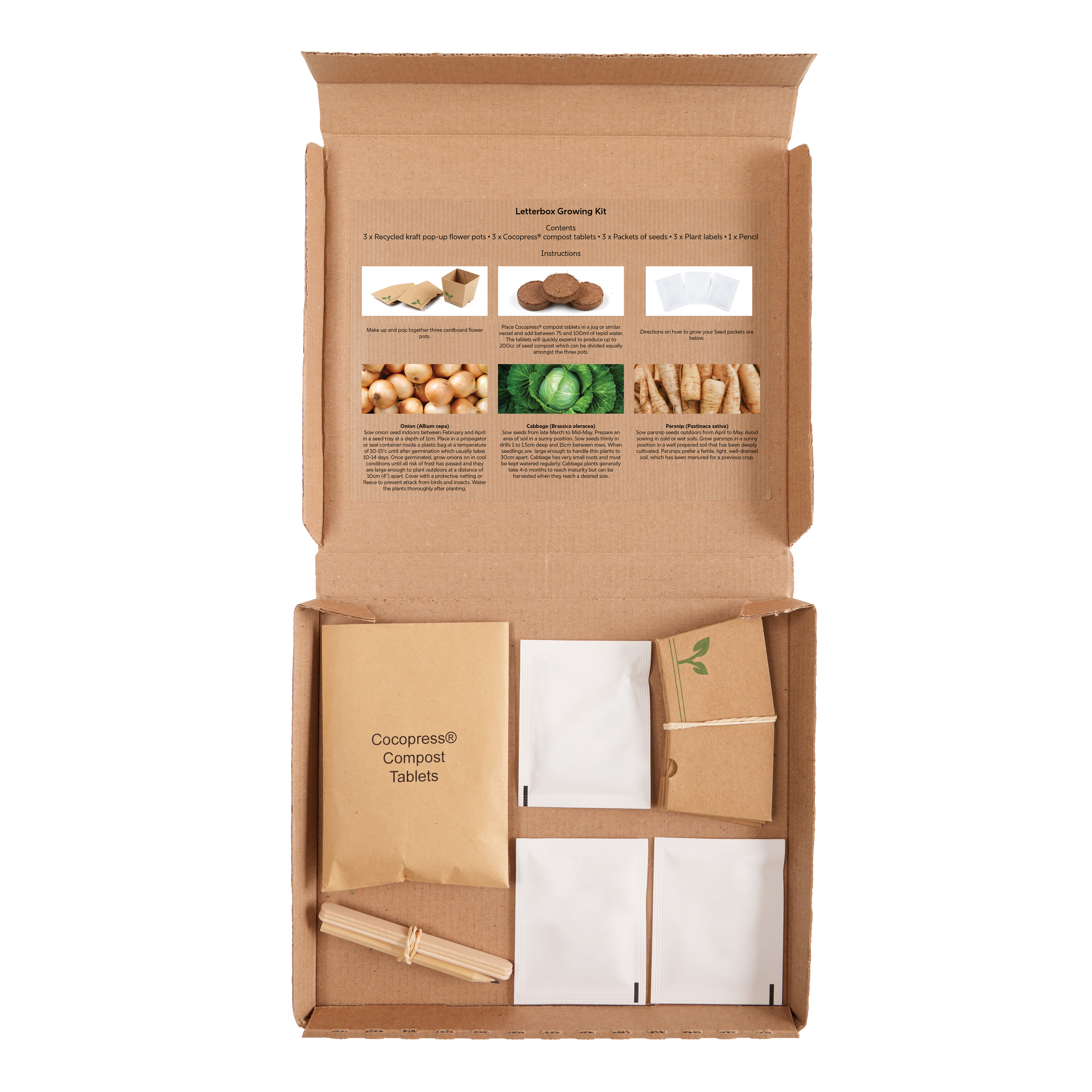 Post-friendly grow kit containing 3 seed packets with a choice of either Flower (butterfly & bee mix, sunflower, cornflower), Herb (basil & chive mix, sage, mint), or Veg (onion, cabbage, parsnip), along with 3 Cocopress® compost tablets, 3 mini natural paper plant pots, 3 plant markers and a mini pencil.