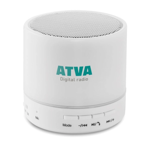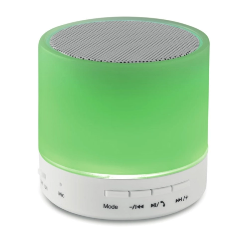 2.1 wireless speaker with LED light indication in ABS. 3 colours changing light. 1 Rechargeable Lithium 500 mAh battery included. Includes a SD card port and an AUX/ USB cable. Hands free call function. Output data: 3W, 4 Ohm. Playing time aprox. 2h.