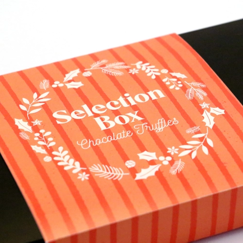 There’s a choco-lot to get excited about this festive season with our large selection box of 24 sublimely smooth, cocoa-rich, luxury chocolate truffles. This selection box is a step-up from your standard box of chocs. Our busy, SALSA accredited elves have handmade each chocolate truffle with the finest cocoa beans and selected flavours and fillings that will put a seasonal smile on everyone’s face. Find your new festive favourite! Enjoy our cookies and cream white chocolate truffle, perk up with milk chocolate cappuccino cream. Relish our Vegan Dark Chocolate Fondant. Get dreamy with our creamy vanilla, feel christmassy with our milk orange cream or keep it elegantly simple with our chocolate baton bar. These mouth-watering chocolates are beautifully presented in our planet-friendly, fully recyclable box which can be fully personalised with your artwork, branding and merry messages. Contact us to find out more. Each selection box contains an assortment of truffles and 1 x 12 baton bar.