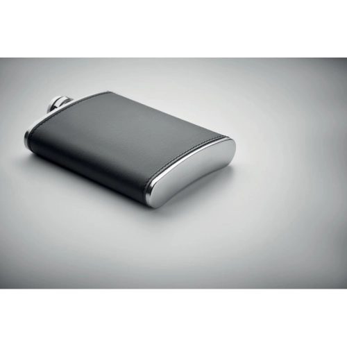 Slim hip flask in stainless steel with PU-leather cover. 200 ml capacity.