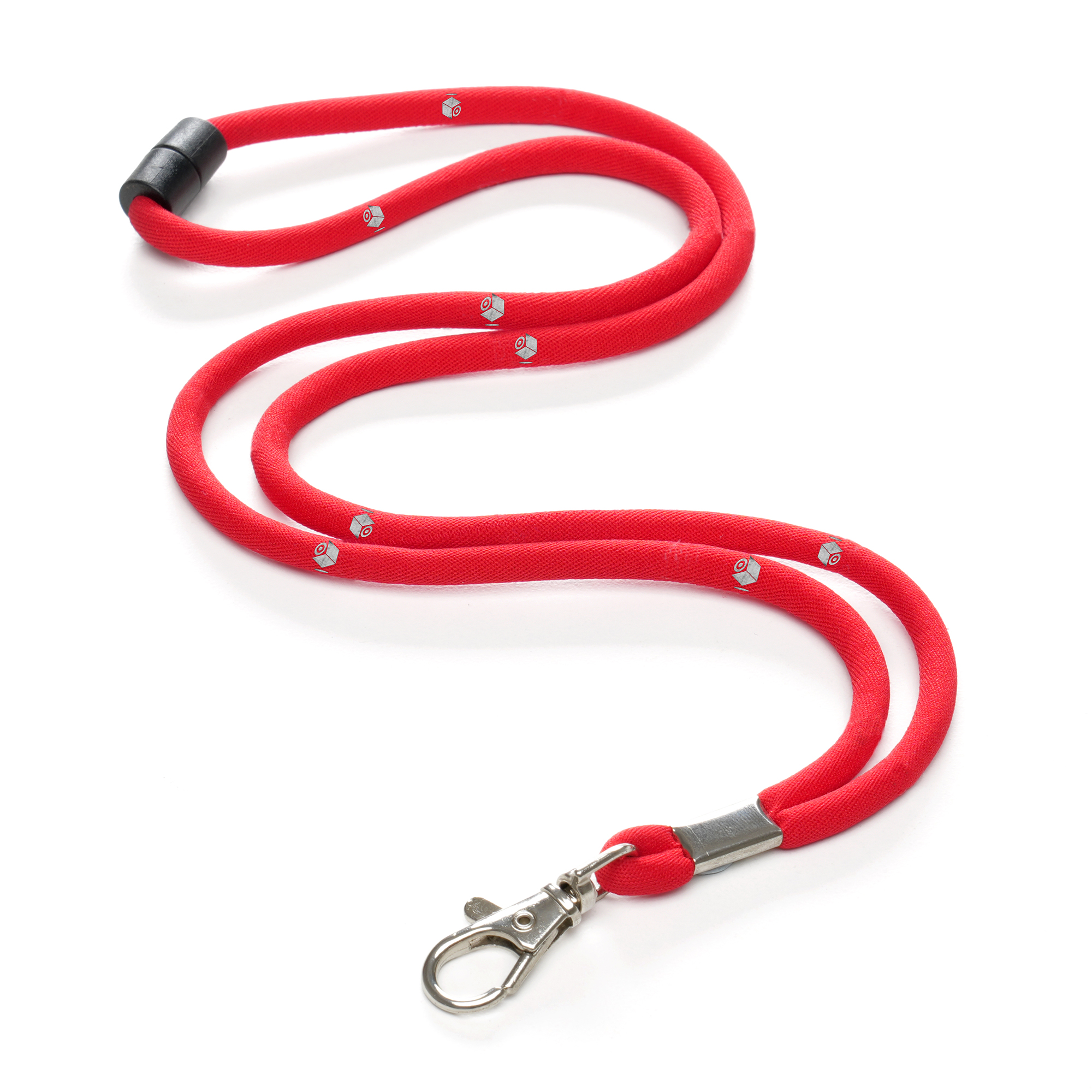 Polyester woven cord lanyard with silver metal swivel trigger clip and black plastic safety break.