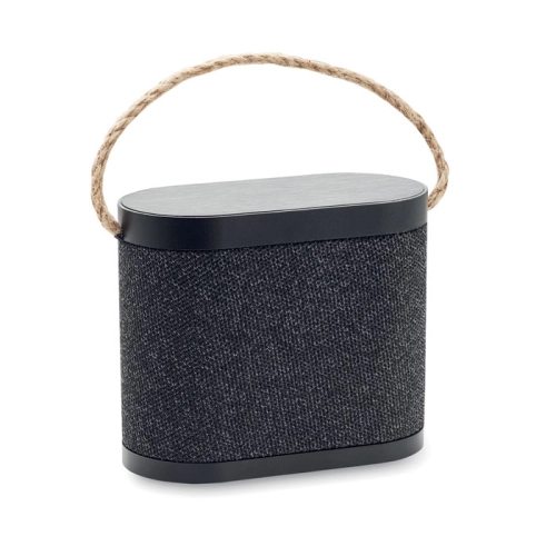 5.3 wireless speaker in ABS with RPET polyester fabric finish and bamboo 15W wireless charger top, with jute handle. 1 Rechargeable Li-Ion 1200 mAh battery. Output data: 5W, 4 Ohm and 5V. Playing time approx. 4h.